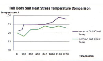 實驗條件:工作人員身穿不同防護服,以3.5英里/小時的速度在跑步機上慢跑3分鐘后測量全身防護服的溫度,再隨時間推移不斷測量防護服內的溫度變化。藍色曲線代表通用防護服,綠色曲線代表使用Demron材料制成的防護服。